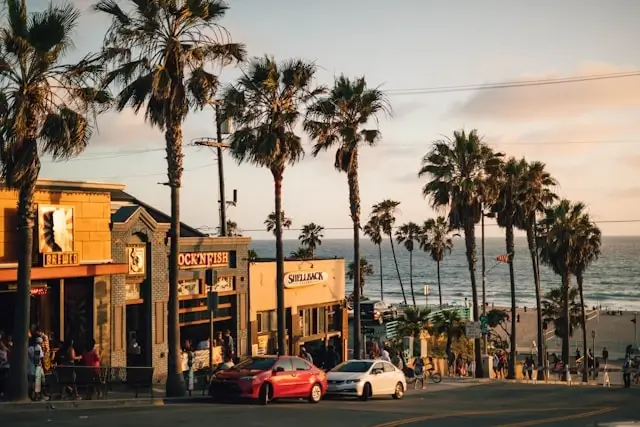 sunset view along Manhattan Beach boardwalk street with palm trees and ocean in the background